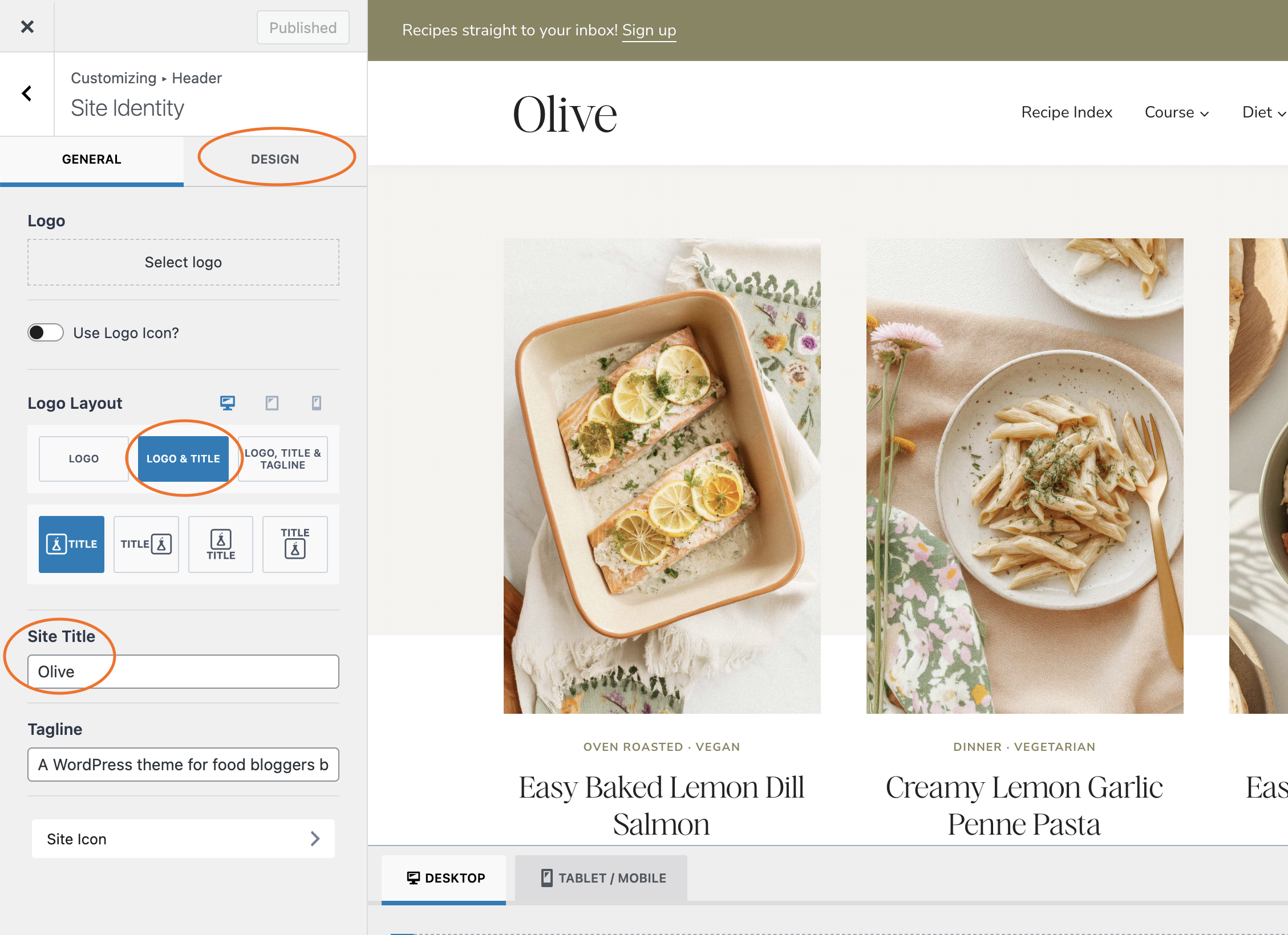 - Click the Design tab to customize the font style, size, and color for your site title