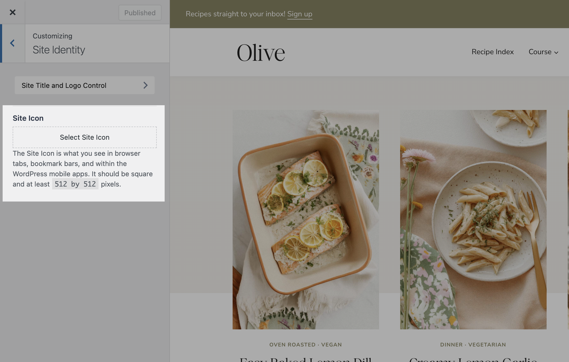 - Go back to the Site Identity settings and click Site Icon