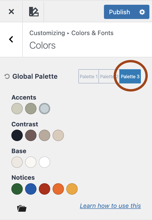 Kadence also includes two additional predefined palettes – Palette 2 and Palette 3. You can switch between these palettes using the tabs at the top of the Colors panel.