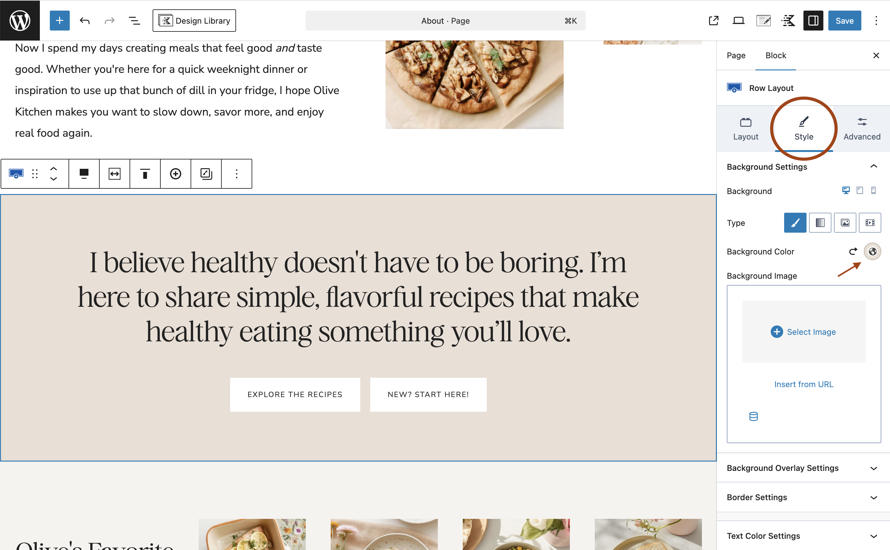 While inside a page or post, click on any Kadence block or row/section, then open the Style tab in the block settings on the right. Kadence blocks include options for background colors, text colors, borders, accents, and more (depending on the type of block).
