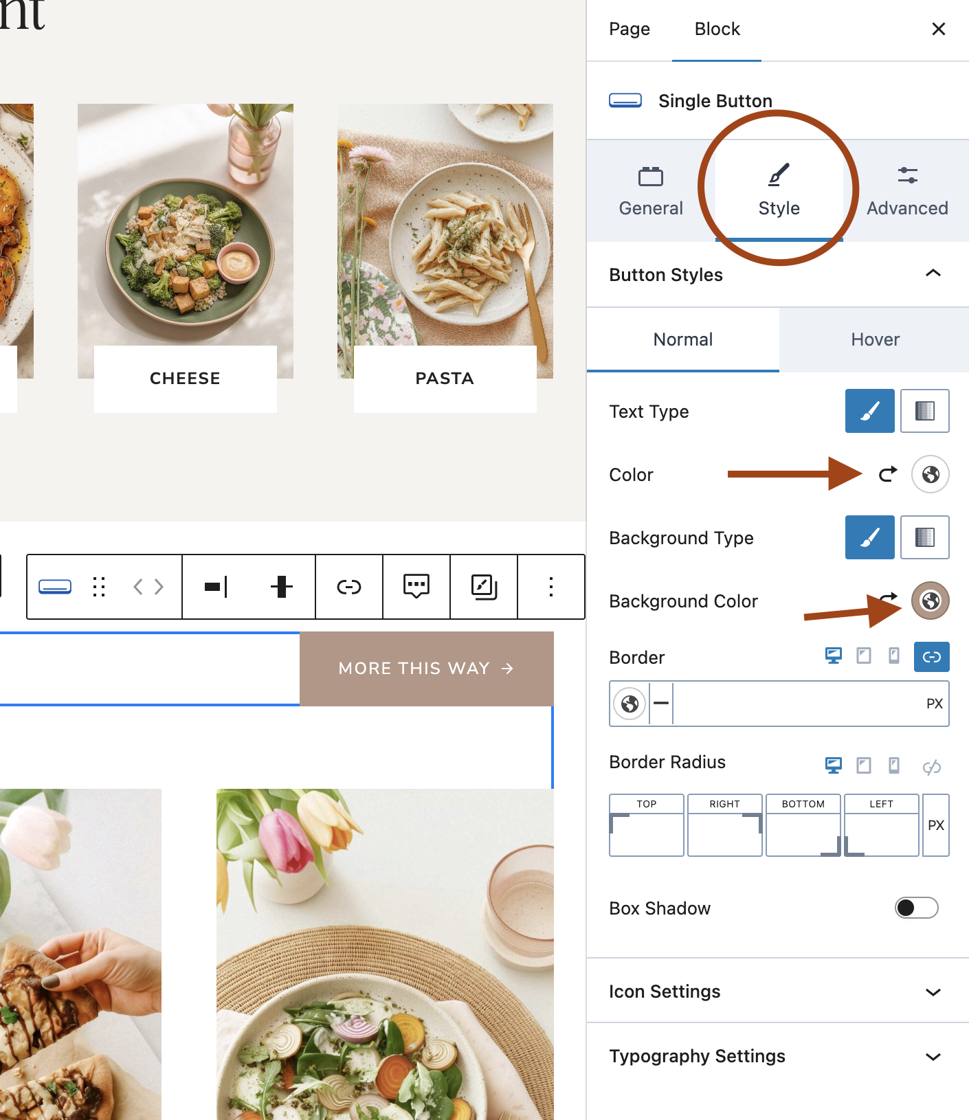 The same applies to headings, text, and button blocks! By default, these will use the global colors and styles you have set in the customizer, but you can update them individually. Click on the text or button you'd like to edit, and go to the Style tab: